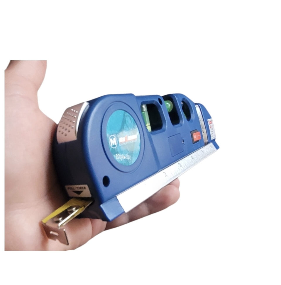 Пузырьковый уровень имеет 3 ярких салатовых глазка, металлическая рулетка встроенная в конструкцию выдвигается на 250 см. Прибор создан из алюминия и покрашен в красный/синий цвет. Основание имеет металлическую линейку 15 см.