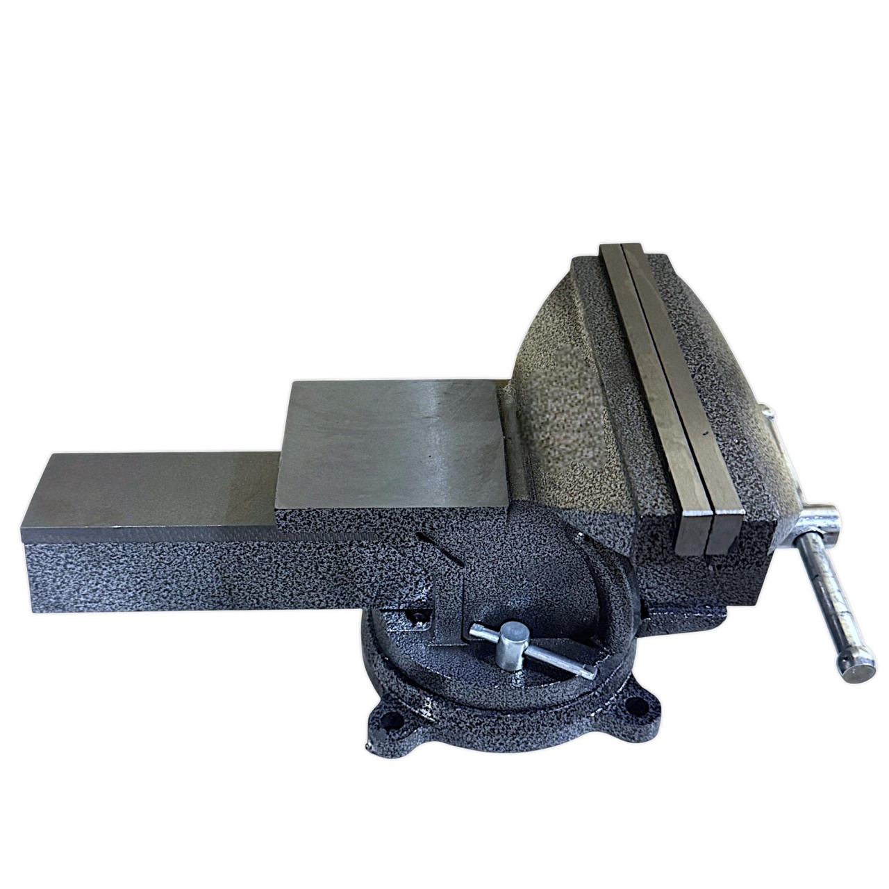 Прочная конструкция – массивные чугунные тиски с поворотным основанием (360°) и двойными фиксаторами обеспечивают быстрое и точное позиционирование заготовки.