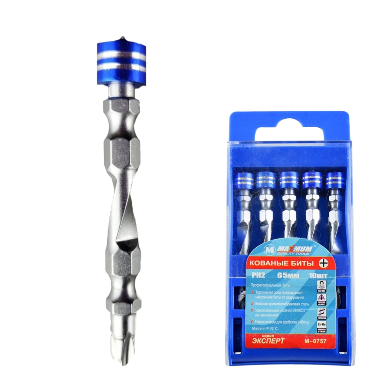 Набор бит кованых PH2, 65 мм, 10 штук, спираль, "MAXIMUM" 0757 из серии "Эксперт" изготовлены из высокопрочной стали S2 и рассчитаны на шестигранный хвостовик 1/4''. Набор в включает в себя ограничители глубины винта, которые предотвращают от повреждения материал для работы.
